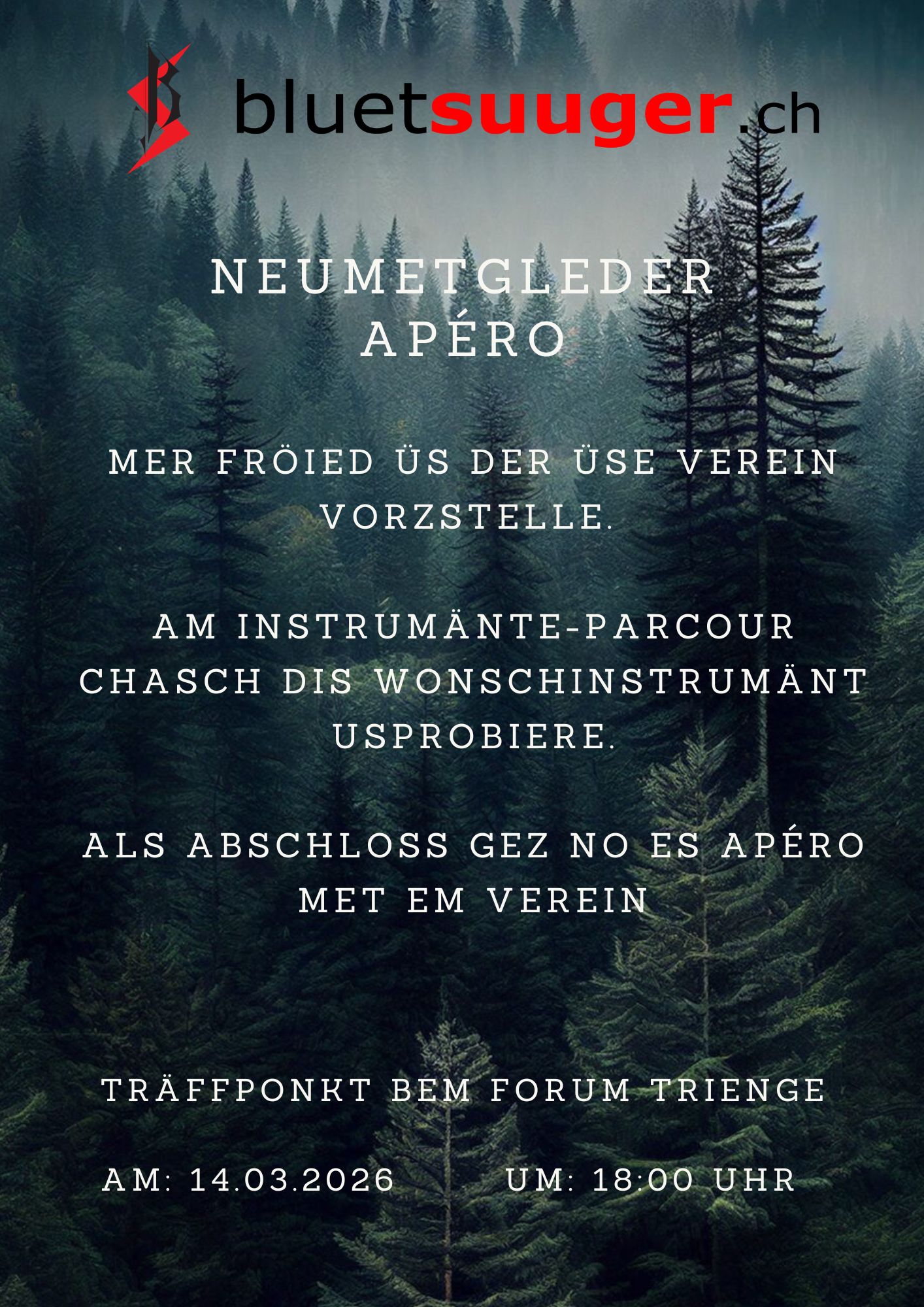 Möchtest du einen Einblick erhalten, was es heisst, bei den Bluetsuuger dabei zu sein? Dann komm am Samstag, 14. März 2026, um 18.00 Uhr ins Forum Triengen. Dort findet unser Anwärterapéro statt, bei dem du unverbindliche Informationen über unseren Verein erhältst. Beim Instrumentenparcours kannst du alle Instrumente ausprobieren und dein Wunschinstrument auswählen. Den Abend lassen wir gemeinsam bei einem gemütlichen Apéro ausklingen.